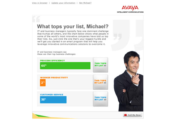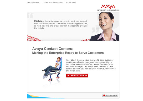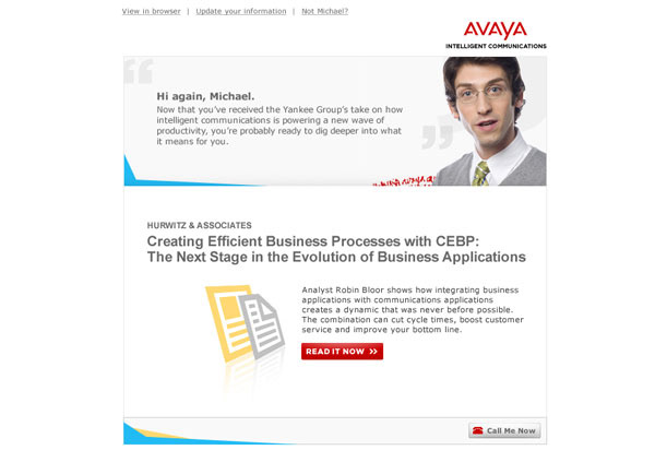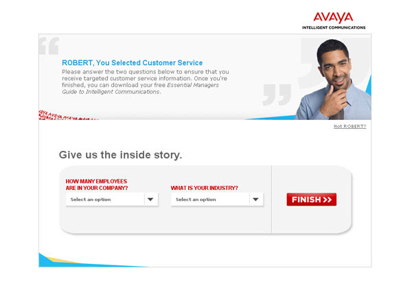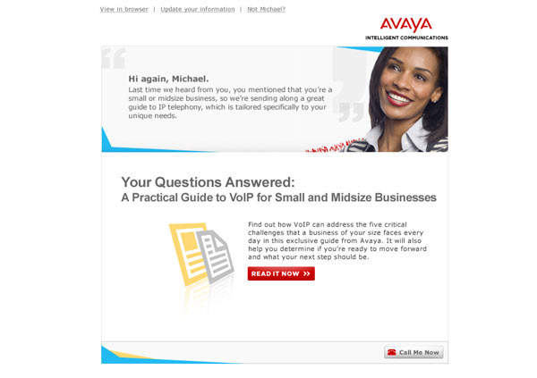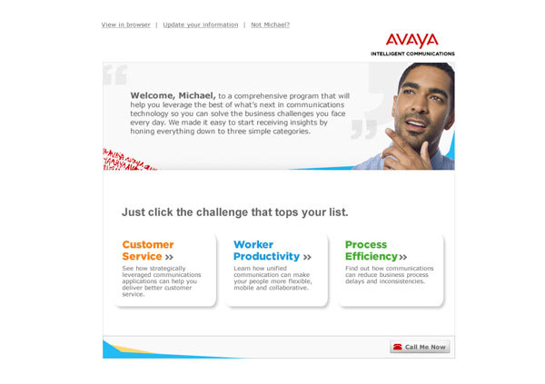 The goal of this project was to improve Avaya's customer relationships by understanding their customer's primary pain point and delivering exclusive content specific to their needs. The program contained 4 primary touch points over a span of a few months in order to maintain an ongoing dialogue and to be top of mind as a solution provider.