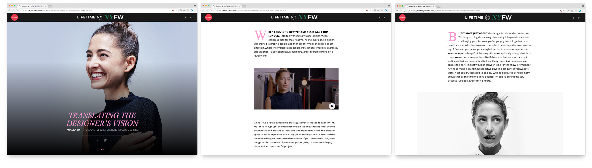 As longform storytelling became a priority for the digital media team at A+E, New York Fashion Week was the perfect place for our Lifetime brand to open the doors and uncover stories. This editorial web piece presents a “Behind the Seams” look at the fashion industry’s unseen craftswomen who inspire and support the biggest names in fashion. Beautiful photography and video clips help tell the stories of designers, tailors, pattern makers, security guards, makeup artists, and even a fashion muse. Given very little time to bring the project to life, the design team was all hands on deck – collaborating with various departments to launch this incredibly fun and lively piece.
